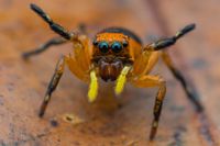 Jumping spiders have probably the best sense of vision among arthropods, what is essential for hunting, navigation and courtship. With their characteristic oversized principal eyes they can detect even smallest details. The three secondary pairs of eyes are sensitive for motion and brightness and give the jumping spider almost a 360° field of view.