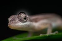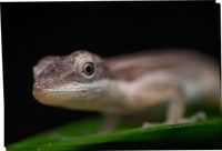 A single image from a series of ten images, only the tip of the anole lizard's nose is in focus.
