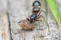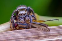 Jumping spiders are extremely skilled hunters and are able to take down prey that is a lot larger than the spider itself. The preferences of the different species are very different. Even within the same species there are both brave and hesitant individuals. The most common are probably opportunistic hunters, who seize every opportunity that presents itself. The hunting tactics are very variable. Some species like "Phaecius sp." lurk for hours looking down and motionless on tree trunks for insects that come too close. Others actively roam their territory and sneak up on their prey like a big cat on a gazelle.